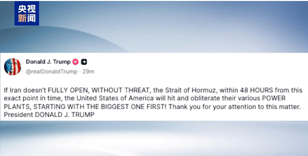 ඉරානය ඉදිරි පැය 48 ඇතුළත හෝමුස් සමුද්‍ර සන්ධිය සම්පූර්ණයෙන් විවෘත නොකළහොත්, එරට බලාගාරවලට පහරදී විනාශ කරන බවට ඇමරිකා ජනාධිපති ඩොනල්ඩ් ට්‍රම්ප් තර්ජනාත්මක ප්‍රකාශයක් සිදු කරයි.